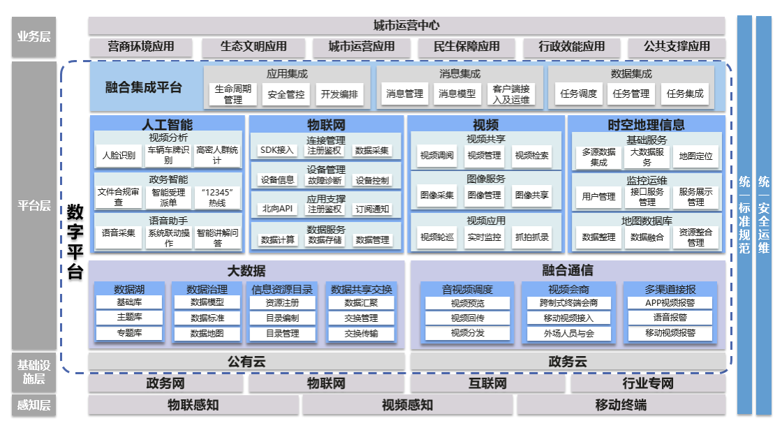 技術(shù)實(shí)現(xiàn)以數(shù)字平臺為核心,提供包括云計(jì)算、大數(shù)據(jù)、時(shí)空信息服務(wù)、視頻云、融合通信、物聯(lián)網(wǎng)、人工智能等能力,統(tǒng)一由能力開放平臺進(jìn)行服務(wù)發(fā)布和接口管理。