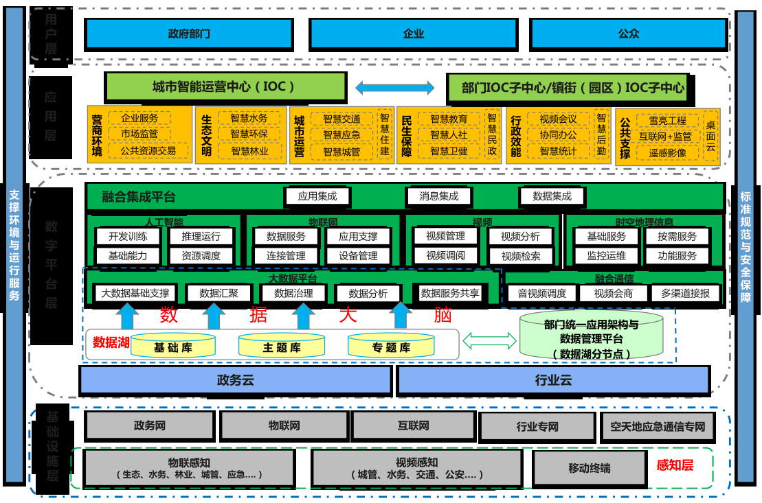 東莞市“數(shù)字政府”建設(shè)采用向下聯(lián)結(jié)城市無處不在的智能終端,中間利用橫向融合云、人工智能、大數(shù)據(jù)、視頻、融合通信,時(shí)空地理信息、物聯(lián)網(wǎng)等新 ICT 技術(shù)的數(shù)字平臺,向上提供服務(wù)能力支撐智慧應(yīng)用的總體架構(gòu)。總體架構(gòu)圖如下所示: