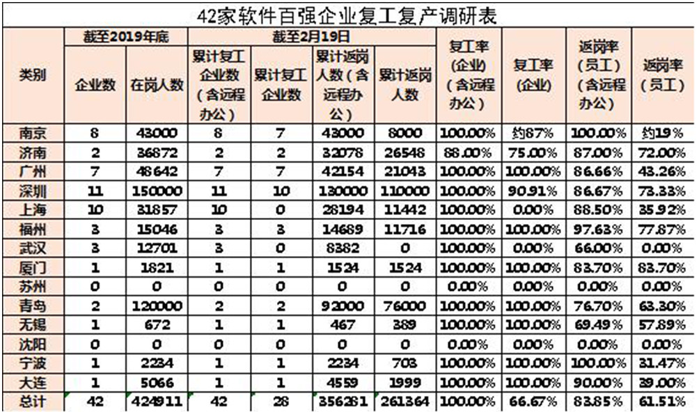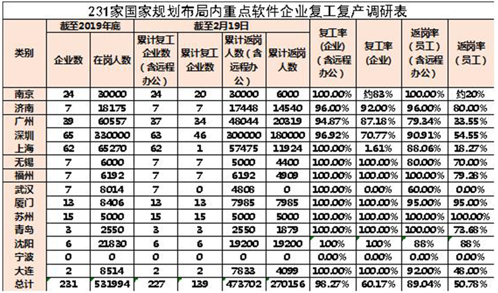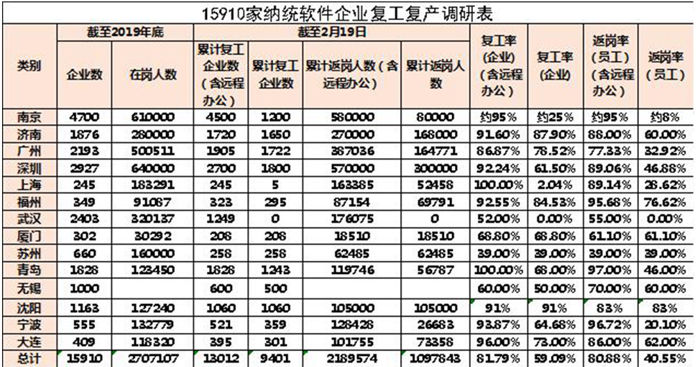 據(jù)中國電子信息產(chǎn)業(yè)發(fā)展研究院賽迪智庫信息化與軟件產(chǎn)業(yè)研究所監(jiān)測,截至2月19日,南京、濟南、廣州、深圳、上海5個綜合型中國軟件名城,福州、武漢、廈門、蘇州、青島5個特色型中國軟件名城,無錫、沈陽、寧波、大連4個創(chuàng)建試點城市,納統(tǒng)企業(yè)共計15910家,復(fù)工13012家,復(fù)工率81.79%,累計返崗(含遠(yuǎn)程辦公)2189574人,返崗率達(dá)80.88%,到崗1097843人,到崗率達(dá)40.55%;其中42家軟件百強企業(yè)已全部復(fù)工,累計返崗(含遠(yuǎn)程辦公)356218人,返崗率達(dá)83.85%,到崗261364人,到崗率達(dá)61.51%;國家規(guī)劃布局內(nèi)重點軟件企業(yè)231家,復(fù)工227家,復(fù)工率98.27%,累計返崗(含遠(yuǎn)程辦公)473702人,返崗率達(dá)89.04%,到崗270156人,到崗率達(dá)50.78%。