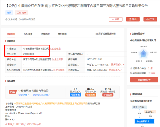 祝賀中檢賽辰技術服務有限公司(簡稱“賽辰”)成功中標中國南京紅色在線-南京紅色文化資源展示和利用平臺項目第三方測試服務項目,中標金額:298000元!